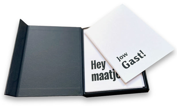 Stel lekker zelf je kaartenset met de kaarten die jij nodig hebt. De kaarten gaan per 5 stuks. Dat houdt het een beetje handelbaar. Minimale afname is 20 kaarten. Je krijgt er de mooie bewaarbox bij. Go your gang.